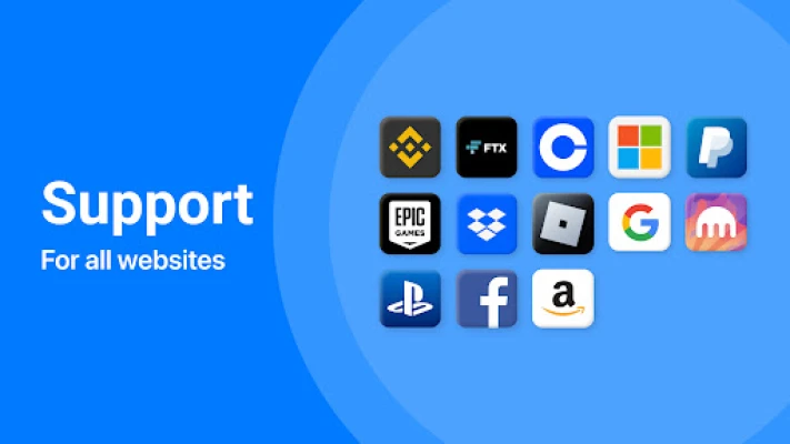 Uygulama, popüler hizmetlerin (ancak bunlarla ilişkili değildir) doğrulamasını destekler ve Facebook, Google Chrome, Coinbase, Binance Playstation, Steam, Amazon, Paypal, Gmail, MS Microsoft, Instagram, Discord, Epic Roblox ve binlerce diğer sağlayıcının 2FA'sını doğrular. Ayrıca, 8 basamaklı şifreler de desteklenmektedir.