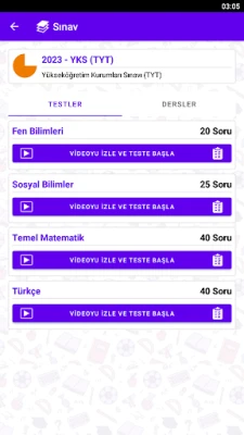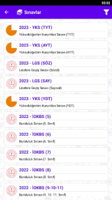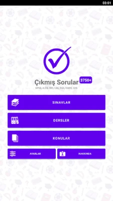 Bu uygulama, Ölçme, Seçme ve Yerleştirme Merkezi'nin (ÖSYM) yaptığı sınavlara ait soruları içermektedir. Bu sınavlar arasında Kamu Personeli Seçme Sınavı (KPSS), Akademik Personel ve Lisansüstü Eğitimi Giriş Sınavı (ALES), Yükseköğretim Kurumları Sınavı (YKS) TYT ve AYT Oturumları, Dikey Geçiş Sınavı (DGS) gibi önemli sınavlar yer almaktadır. Ayrıca Milli Eğitim Bakanlığı'nın (MEB) düzenlediği Liselere Geçiş Sınavı (LGS), Parasız Yatılı ve Bursluluk Sınavı (PYBS), İlköğretim ve Ortaöğretim Kurumları Bursluluk Sınavı (İOKBS) ve Görevde Yükselme Sınavı (GYS) sınavlarına ait sorular da uygulamada bulunmaktadır.