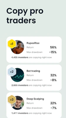Birkaç tıklamayla, deneyimli yatırımcıların desteklediği stratejilere erişebilir, gerçek zamanlı işlemleri izleyebilir ve en iyi performans gösteren yatırımcıların kararlarını ve görüşlerini takip ederek hesabınızı büyütebilirsiniz.