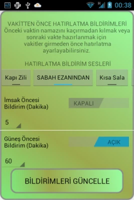 Kullanıcılar istedikleri zaman veya vakitten önce bildirimler alabilirler. İmsak vaktinden önce bildirim ayarlayarak sahur vaktinde uyandırılabilirler. Namaz vakti geldiğinde, cihaz kullanıcıları uyarır. Bildirimler kapatılabilir veya açılabilir, farklı bildirim sesleri kullanılabilir. Uzun süren bildirim sesleri için, kullanıcılar bildirim simgesine dokunarak, uygulamayı başlatabilir veya uygulamanın içindeyken geri tuşunu kullanarak sesi kapatabilirler. Bildirimleri alabilmek için uygulamayı ilk kez yükleyenler veya yeniden yükleyenlerin bildirim ayarları ekranına girmeleri gerekmektedir.