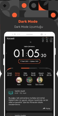 Ezan Vakti uygulaması, kullanıcıların namaz vakitlerinde zamanında uyarı alabilmelerini sağlar. Ayrıca hatırlatma özelliği sayesinde kullanıcılar, vakitler girmeden önce hatırlatma alabilirler. Uygulama aynı zamanda vakitlerde otomatik olarak sessize alma özelliği sunar, böylece kullanıcıların rahatsız edilmesi önlenir.