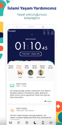 Bu uygulama, Türkiye vakitlerine uyumlu olarak çalışır ve ayrıca kullanıcılara Hicri Gün ve Ay bilgilerini de sağlar. Ayrıca otomatik kaza takibi özelliği sayesinde kullanıcılar kaçırdıkları namazları takip edebilirler. Kıble pusulası ve haritası sayesinde kullanıcılar, doğru yöne yönelerek namaz kılabilirler.