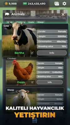 🚜 Çiftlik Hayvanları Yetiştir: Hayvanlarınızın mutlu ve iyi beslenmiş olduğundan emin olmalısınız. Akıllı çiftleştirme ve doğru yönetimle hayvanlarınızın kalitesini artırabilirsiniz.