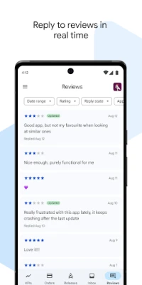 Uygulama incelemelerini görüntülemek ve yanıtlamak için bu uygulamayı kullanabilirsiniz. Kullanıcıların uygulamanızla ilgili yaptığı yorumları görüntüleyerek, uygulamanızın performansı ve kullanıcı deneyimi hakkında bilgi sahibi olabilirsiniz. Ayrıca, kullanıcıların sorularına veya şikayetlerine yanıt vererek, onlarla iletişime geçebilir ve uygulamanız hakkında olumlu bir imaj oluşturabilirsiniz. Bu şekilde, kullanıcılarınızın uygulamanızla ilgili düşüncelerini anlamak ve onlarla iletişim kurmak için bu uygulamayı kullanabilirsiniz.