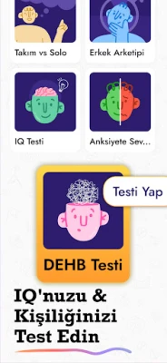 Uygulama içerisinde ayrıca dikkat eksikliği hiperaktivite bozukluğu, anksiyete türleri, duygusal zeka, baskın beyin tipi gibi konularda testler de bulunmaktadır. Bu sayede zihinsel sağlığınızı, bilişsel yeteneklerinizi ve kişilik özelliklerinizi keşfedebilirsiniz.