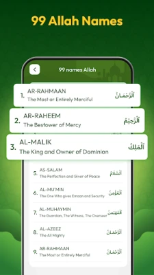 Uygulamanın diğer bir özelliği ise, Allah'ın Arapça 99 anlamlı ismini içermesidir. Kullanıcılar, bu isimlerin anlamlarını da uygulama üzerinden öğrenebilirler. Ayrıca sabah ve akşam namazları için okunması tavsiye edilen azkar da uygulama içerisinde yer almaktadır. Bu sayede kullanıcılar, namazlarını daha kolay bir şekilde okuyabilirler.