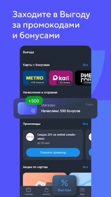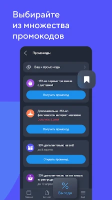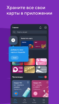 У нас var sadece indirim kartları bulunmaktadır, kuponlar, promosyon kodları ve fırsatlar. Ayrıca, Kazanç bölümü de bulunmaktadır, burada alışverişlerinizi hem avantajlı hem de kolay hale getirecek her şeyi topluyoruz. Ve tüm bunlar internet bağlantısı olmadan da çalışıyor.