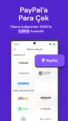Pawns.app, kullanıcılara hızlı nakit ve hediye kartı çekme imkanı sunar. Kullanıcılar, kazançlarını PayPal, Visa veya popüler dijital hediye kartları ile çekebilirler. Bu esnek ödeme seçenekleri sayesinde ödüller dilediği zaman kullanılabilir.