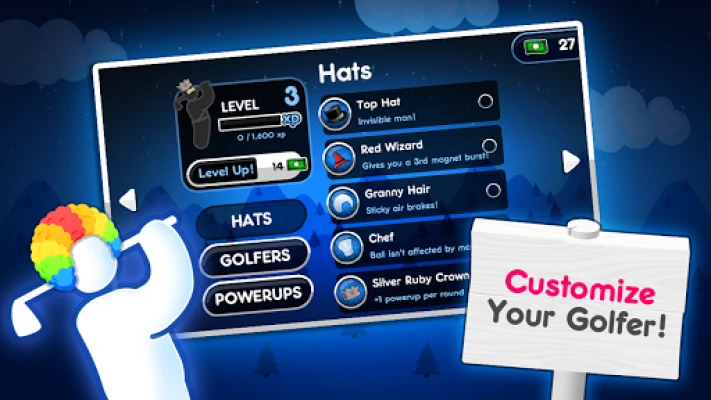 Özelleştirilebilir Karakterler. Yeni açılabilir karakterler ve daha değerli şapkalarla kalabalıktan ayrılın. Her şapka benzersiz bir yetenek içerir ve bazıları diğerlerinden daha nadirdir. Hepsini toplayabilir ve sertifikalı bir Super Stickman Golf Efsanesi olabilir misiniz?