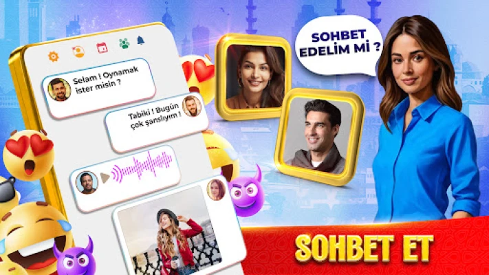 VIP Okey, Türkiye'nin her yerinden yeni arkadaşlar edinip canlı sohbet etme fırsatı sunar. Arkadaşlarınızla oynayabilir, genel veya özel sohbetler yapabilir, canlı sesli sohbet özelliğini kullanabilir, emoji ve hediyeler gönderebilirsiniz.
