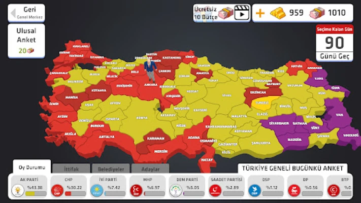 Tüm bu özelliklerin yanı sıra, Yerel Seçim Oyunu 2024, rakiplerinize karşı kazanmak için tüyolar ve püf noktaları da sunar. Örneğin, miting yapmadığınız illerde oy oranınızın düşebileceği gibi, tüm illere giderek miting yapmanız seçmenlerin ilgisini çekebilir ve daha fazla oy almanızı sağlayabilir.