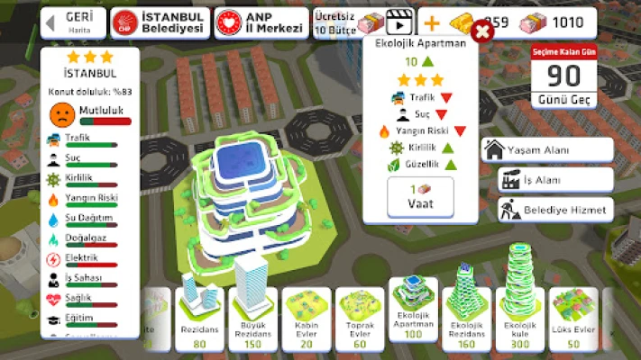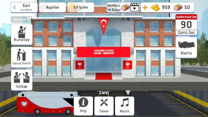 Oyunu oynarken, il merkezleri kurarak bütçe gelirlerinizi ve oylarınızı artırabilirsiniz. Parti merkezinizi geliştirerek daha güçlü bir parti haline gelebilir, TV programlarına çıkarak ülke çapında puanınızı artırabilir ve mitinglerde seçmenlerinizin dikkatini çekebilirsiniz.